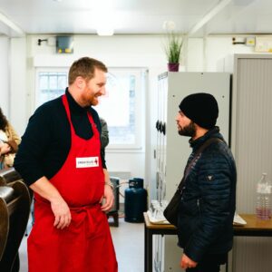 Le chef Julien Lapraille a enfilé son tablier pour préparer un repas aux 120 personnes sans abri, sans chez-soi ou en…